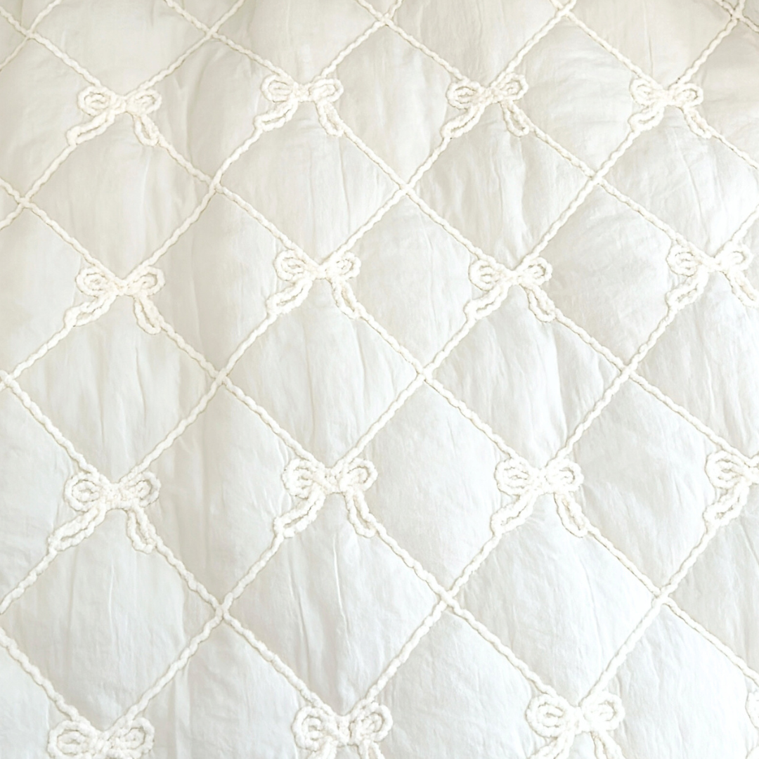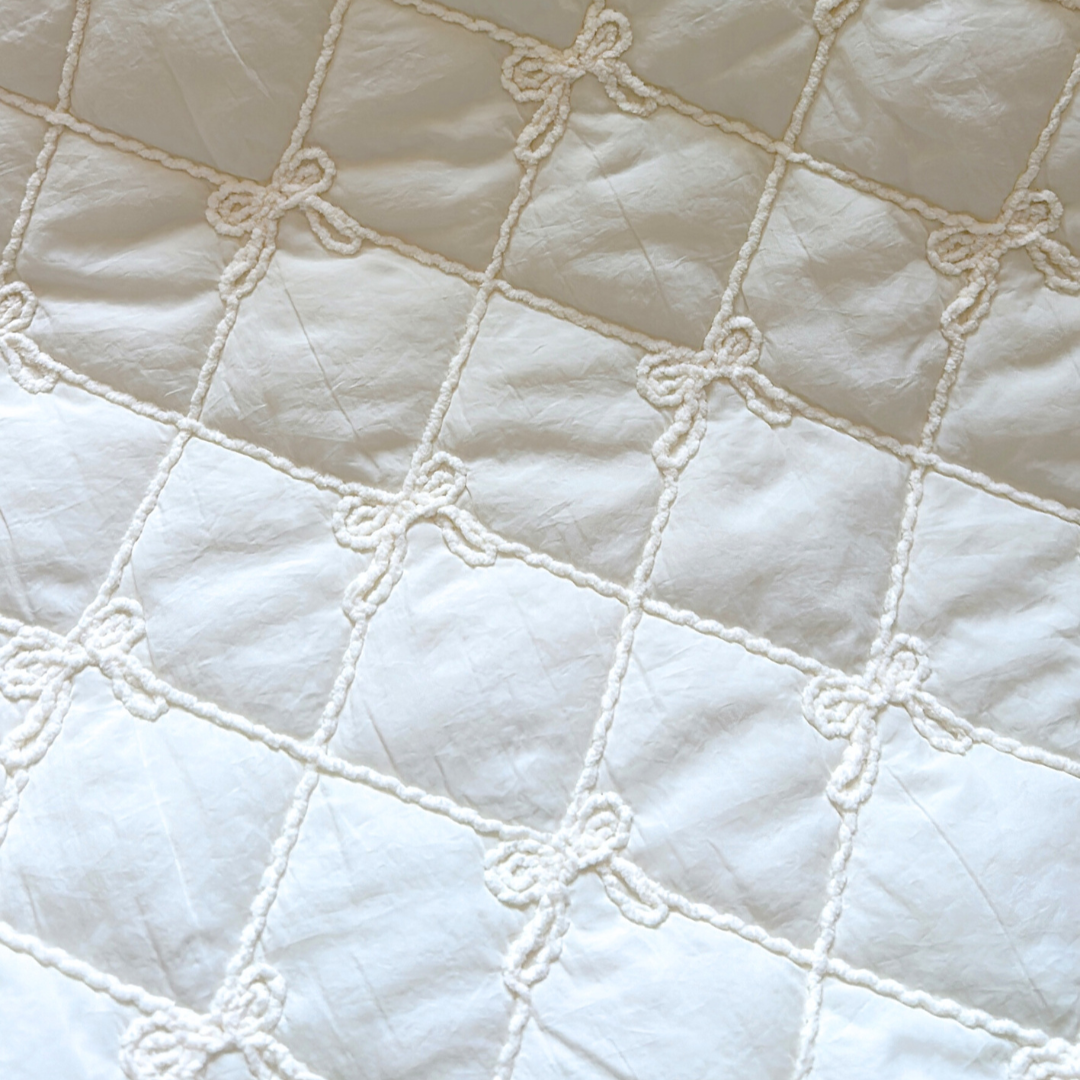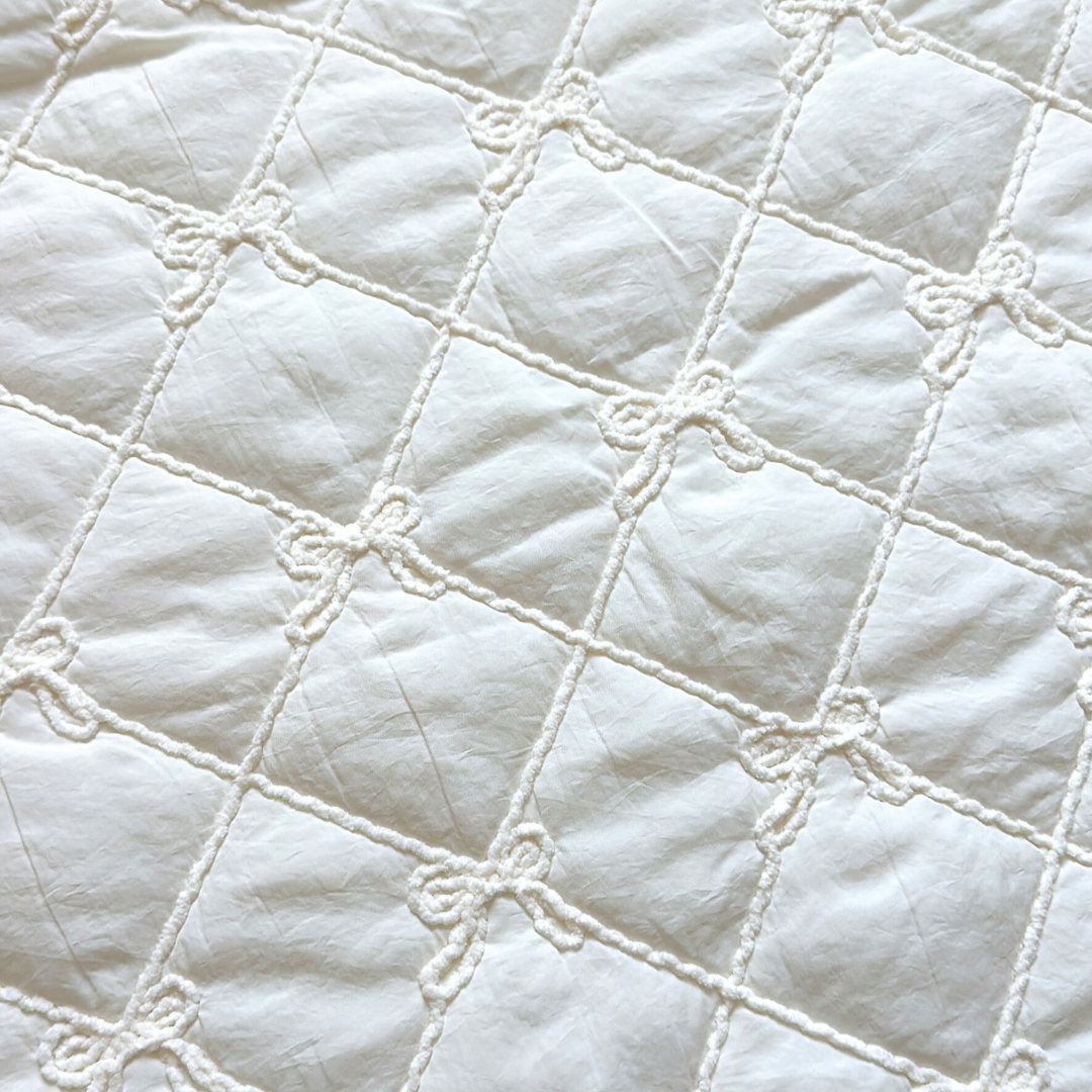 ニットで仕上げたリボン刺繍が格子状に並んだ、