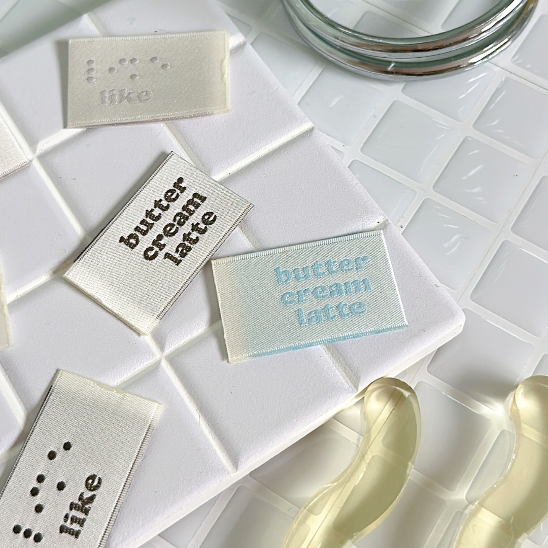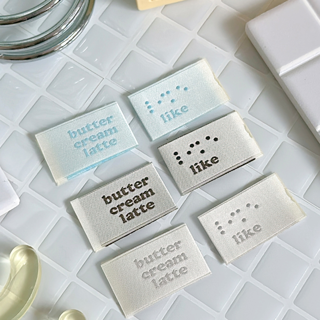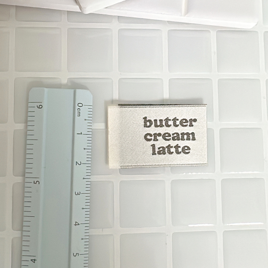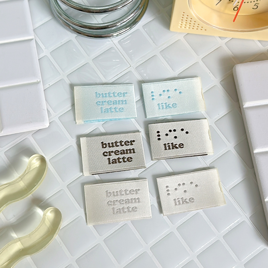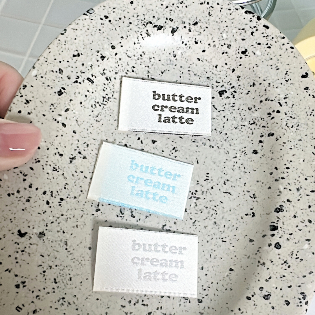 やわらかいラテカラーに「butter cream latte」と刺繍された、シンプルでおしゃれな韓国風デザインのループタグ☕