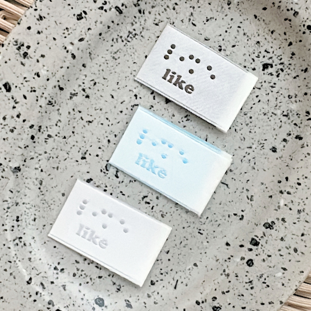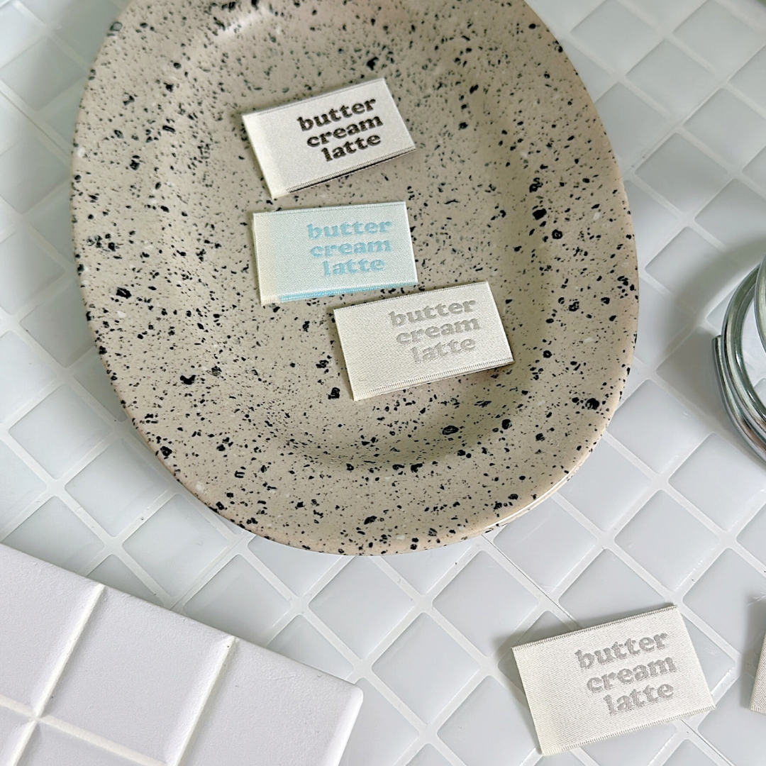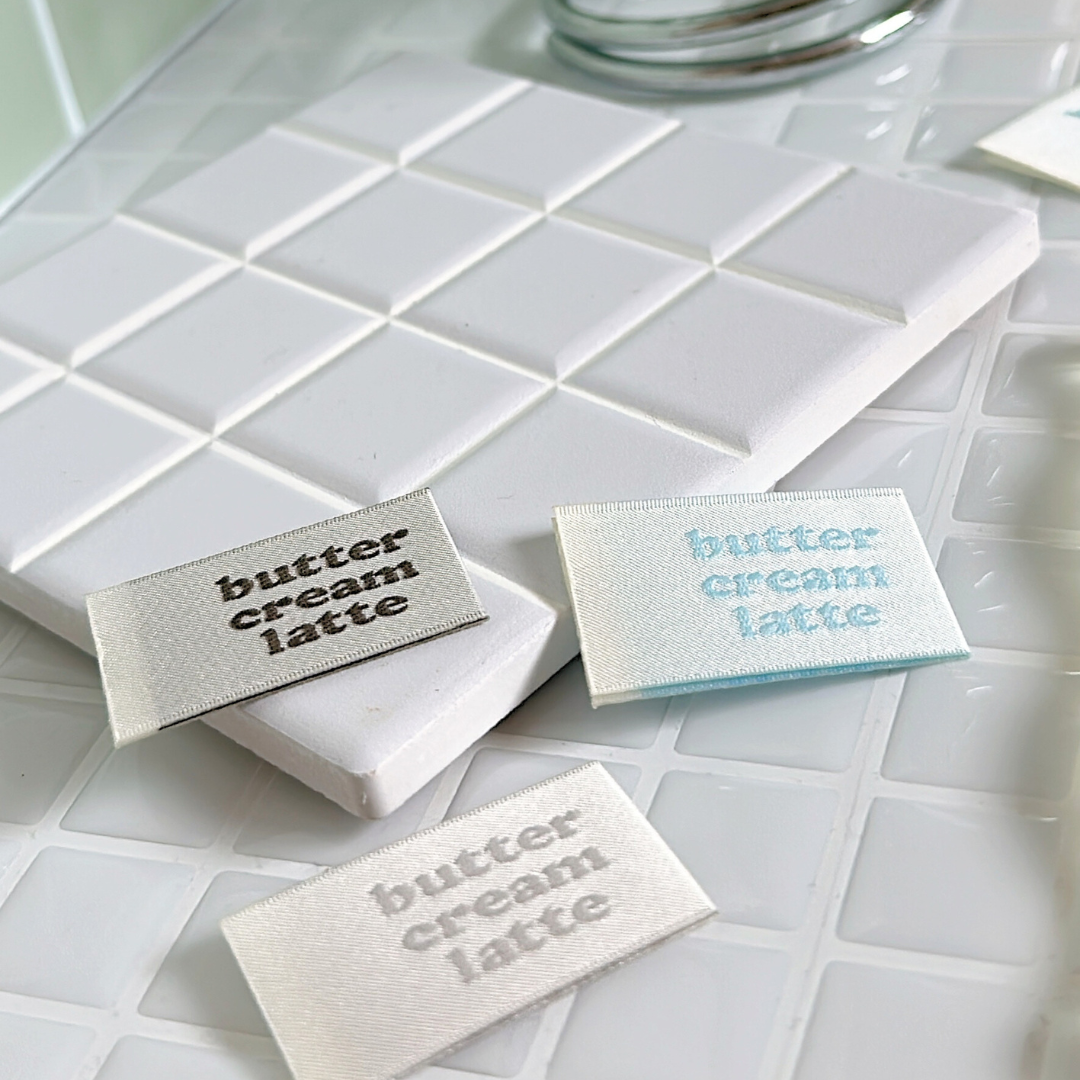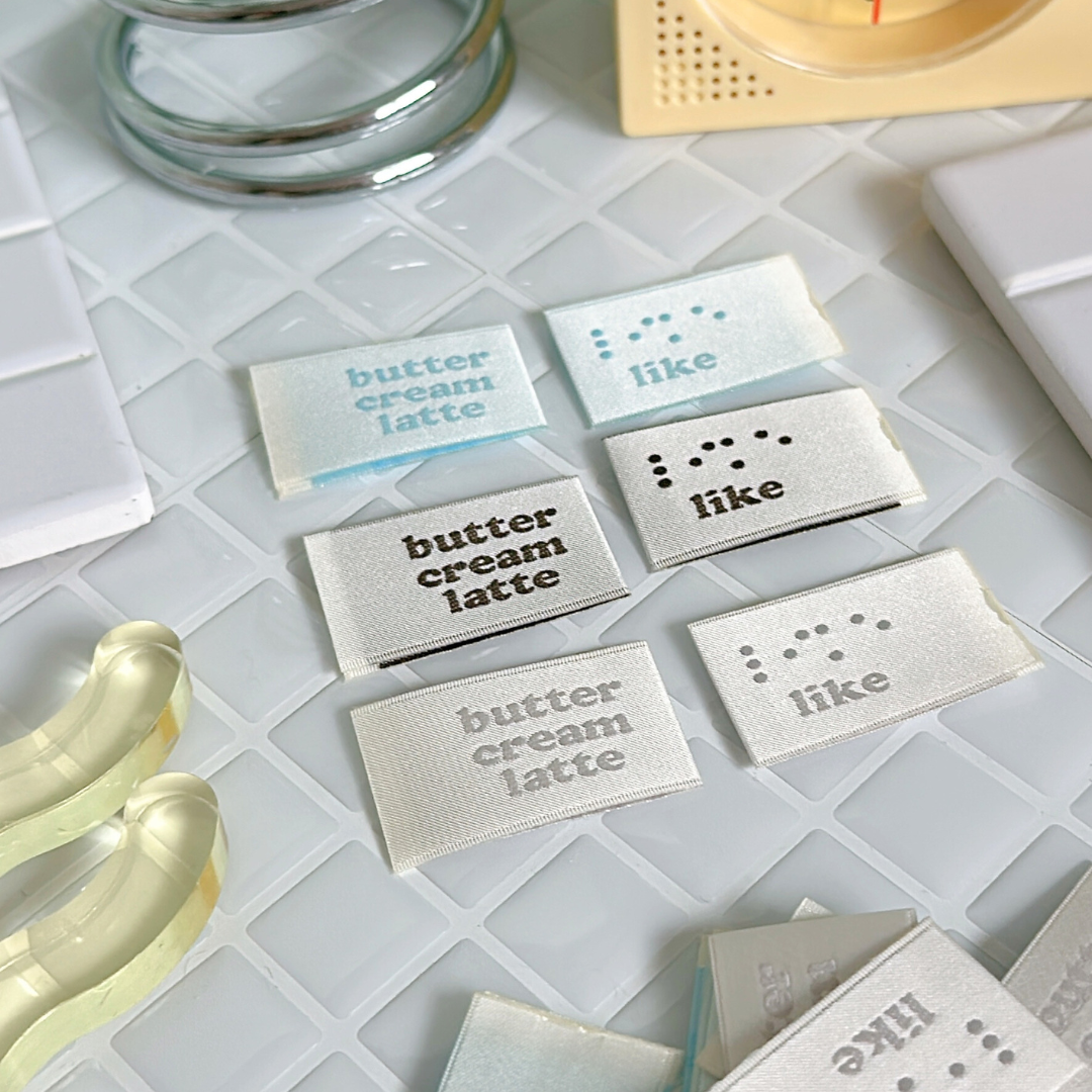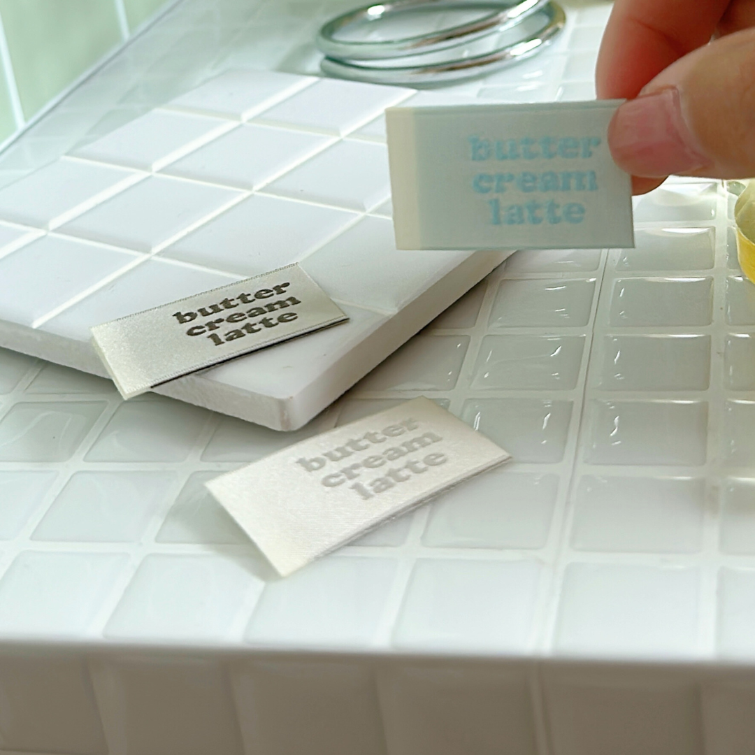やわらかいラテカラーに「butter cream latte」と刺繍された、シンプルでおしゃれな韓国風デザインのループタグ☕